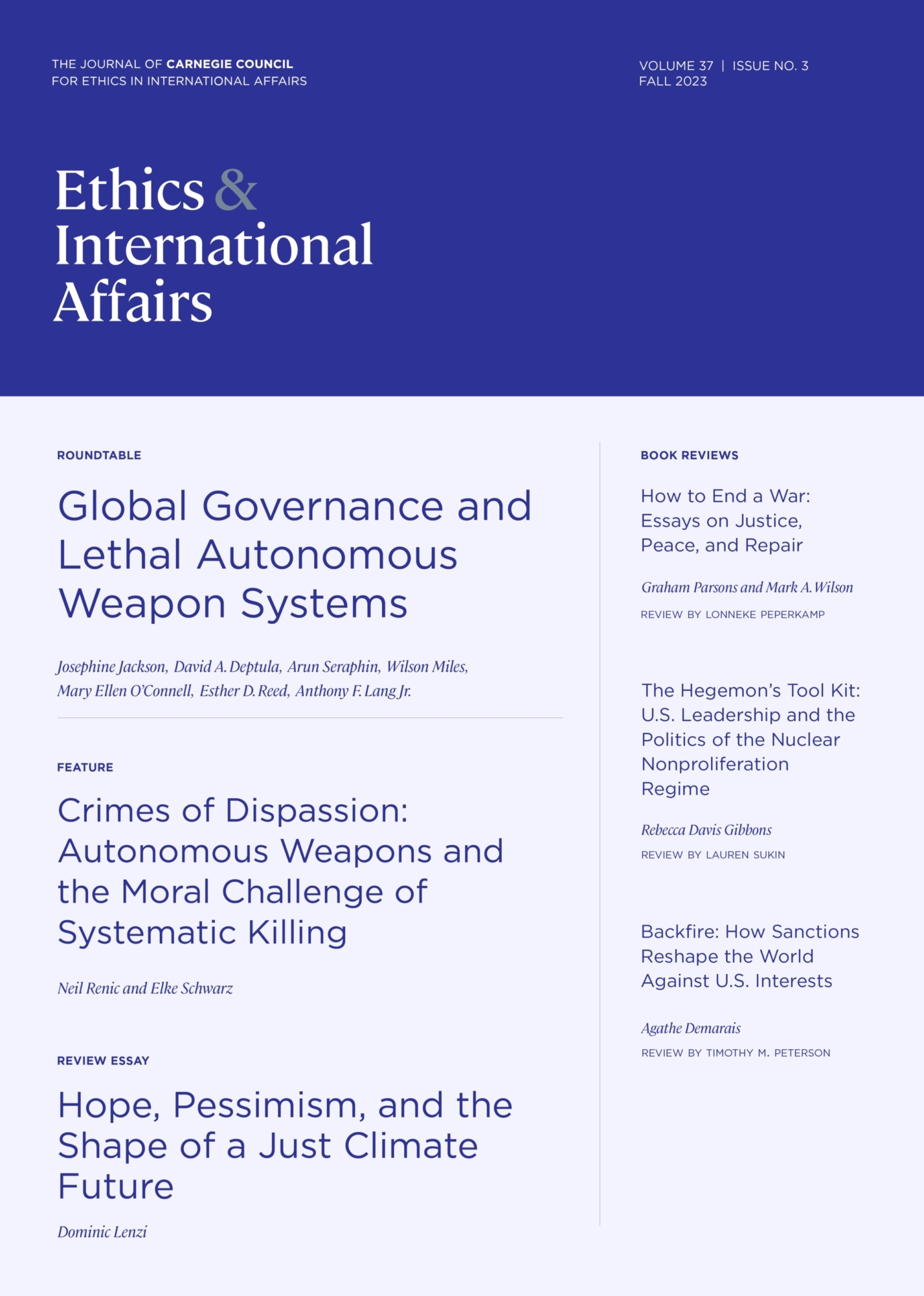 The editors of Ethics & International Affairs are pleased to present the Fall 2023 issue of the journal! The highlight of this issue is a roundtable organized by Josephine Jackson on global governance and lethal autonomous weapons systems (LAWS), featuring contributions by Josephine Jackson, David A. Deptula, Arun Seraphin and Wilson Miles, Mary Ellen O'Connell, Esther D. Reed, and Anthony F. Lang Jr. Additionally, the issue includes a feature article by Neil Renic and Elke Schwarz on autonomous weapons and the moral challenge of systematic killing. The issue also contains a review essay by Dominic Lenzi on a just climate future, and book reviews by Lonneke Peperkamp, Lauren Sukin, and Timothy M. Peterson.