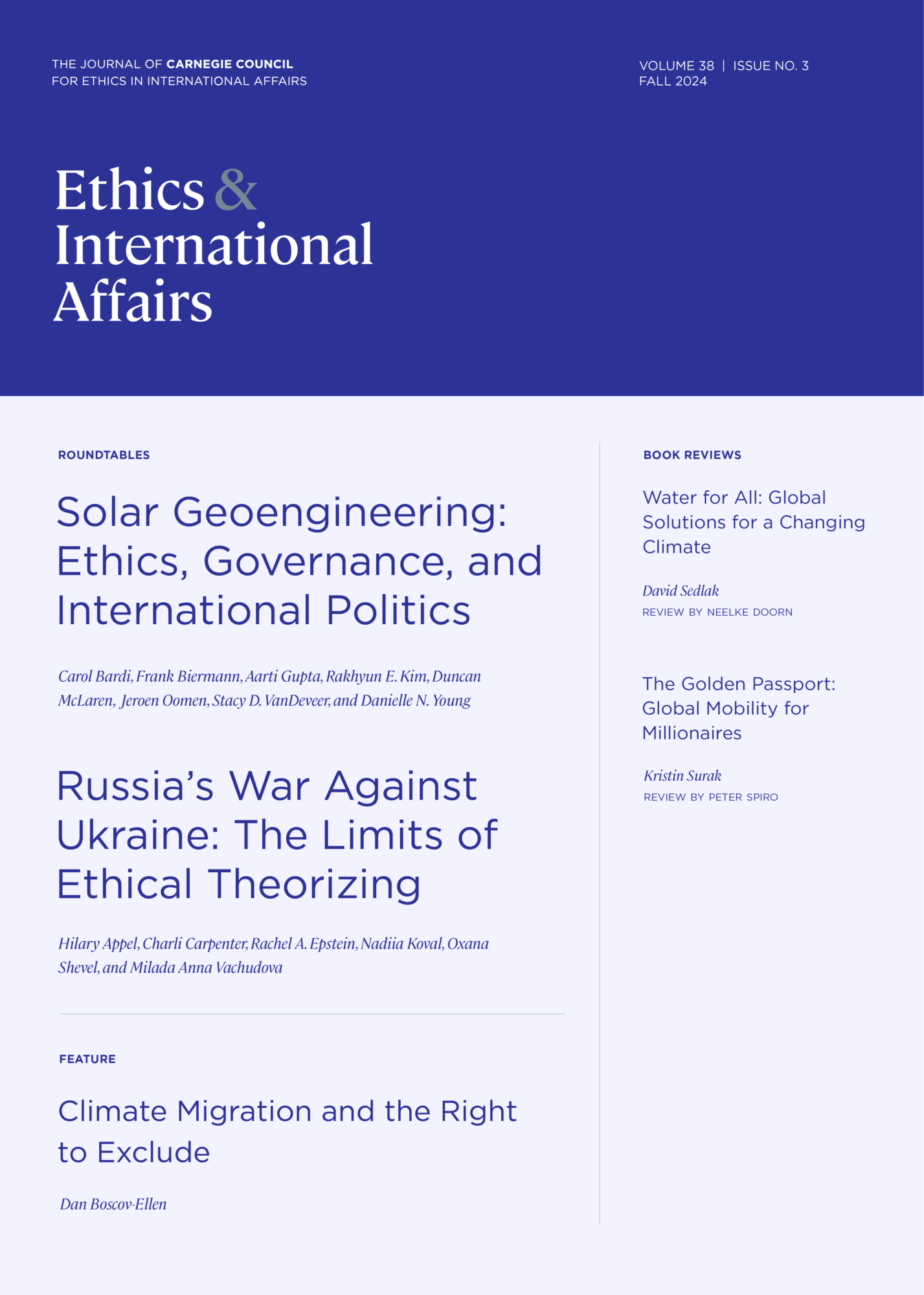 The editors of Ethics & International Affairs are pleased to present the Fall 2024 issue of the journal. The issue contains a roundtable organized by Danielle Young on the ethics, governance and politics of solar geoengineering, featuring contributions by Duncan McLaren, Jeroen Oomen, Stacy VanDeveer, Frank Biermann, Rakhyun Kim, Carol Bardi, and Aarti Gupta, and Danielle Young. The issue also contains a roundtable on Russia's war against Ukraine and the limits of ethical theorizing, organized by Hilary Appel and Rachel A. Epstein, featuring contributions by Milada Anna Vachudova and Nadiia Koval, Oxana Shevel, Charli Carpenter, and Hilary Appel and Rachel A. Epstein. Additionally, the issue includes a feature article by Dan Boscov-Ellen on climate migration. The issue also contains book reviews by Neelke Doorn and Peter Spiro.