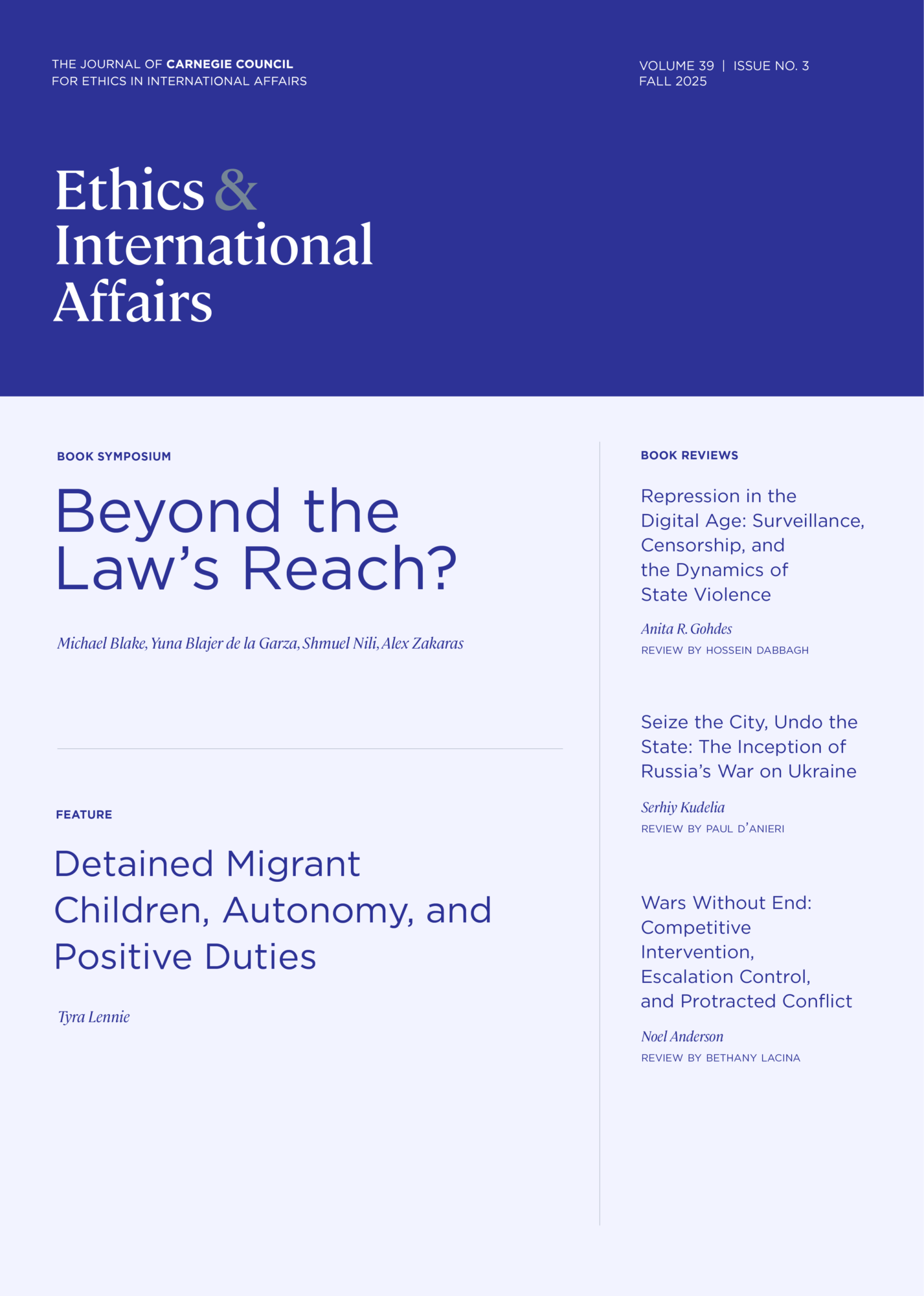 The editors of Ethics & International Affairs are pleased to present the Fall 2025 issue of the journal. The issue contains a book symposium organized by Yuna Blajer de la Garza on Shmuel Nili's Beyond the Law's Reach?, featuring contributions by Michael Blake, Alex Zakaras, Yuna Blajer de la Garza, and a reply by Shmuel Nili. The issue also contains a feature article by Tyra Lennie on the moral duties we owe to migrant children in the context of detention, and book reviews by Hossein Dabbagh, Paul D'Anieri, and Bethany Lacina.