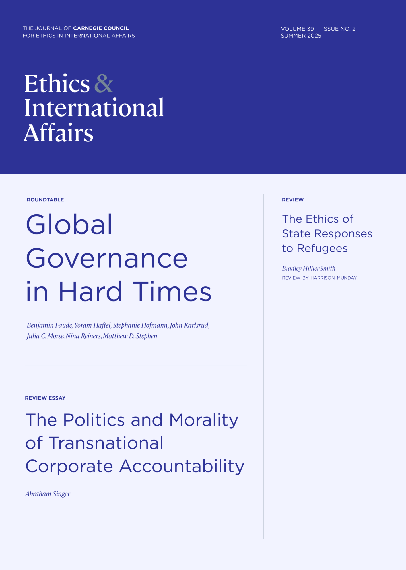 The editors of Ethics & International Affairs are pleased to present the Summer 2025 issue of the journal. The issue contains a peer-reviewed roundtable organized by Benjamin Faude and John Karlsrud on global governance in hard times, featuring contributions by Benjamin Faude and John Karlsrud, Yoram Z. Haftel and Stephanie C. Hofmann; Matthew D. Stephen; Julia C. Morse; and Nina Reiners. The issue also contains a review essay by Abraham Singer on the politics and morality of transnational corporate accountability, and a book review by Harrison Munday.